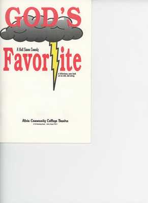God's Favorite is a comedy by Neil Simon that retells the biblical story of Job in a modern setting. The play centers on Joe Benjamin, a wealthy and successful businessman whose comfortable life is suddenly turned upside down when a wisecracking messenger from God appears. Tasked with testing Joe’s faith, the messenger subjects him to a series of outrageous disasters meant to strip away his wealth, security, and pride.